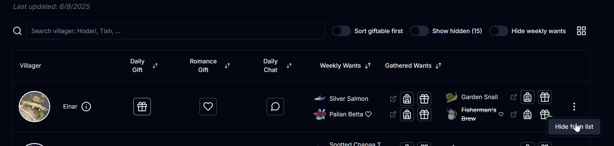 Palia MapIt'd be nice if we can filter it, since once you max villager relationships you don't really have to keep giving them gifts, or if you're just trying to max out specific villager relationships, for example romanceable characters, it would be nice to choose which villagers can be hidden and can be shown, that way its less work to figure out what items to get. Palia tracker already has this feature: i.zyrl.space/kY4SGK7q.png So it would be nice if we can have that on the map's weekly wants too.